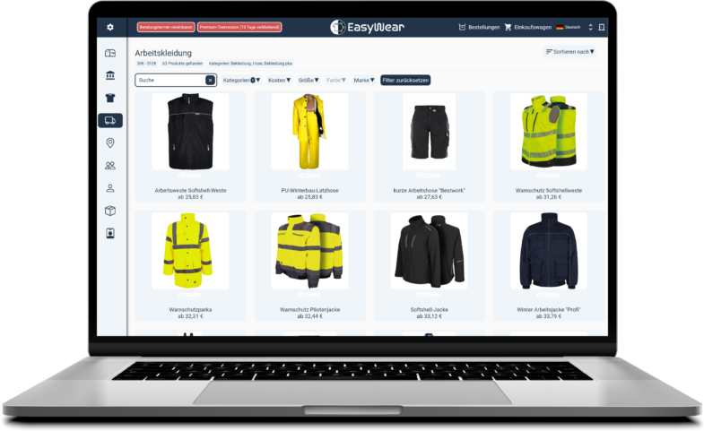 I rivenditori e i produttori possono entrare a far parte della piattaforma EasyWear e presentare i loro prodotti in un'area centralizzata. Negozio web di abbigliamento da lavoro visibile a tutti gli utenti di EasyWear e ordinabile direttamente dalle aziende. In alternativa, offriamo una soluzione whitelabel: una versione di EasyWear con un marchio individuale che può essere utilizzata come un prodotto a sé stante. Negozio web di abbigliamento da lavoro per i vostri clienti. Vi sono esposti solo i vostri prodotti, senza alcuna concorrenza nell'assortimento. L'amministrazione integrata in background sostituisce il precedente web shop, automatizza molti processi e crea un reale valore aggiunto per fornitori e clienti.